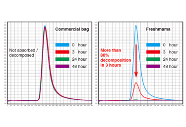 We have conducted experiments to confirm that the ethylene decomposition pad developed has ethylene decomposition and excretion activity. The verification tests were conducted as follows: 2 liters of a standard ethylene gas of 10 to 300 ppm was sealed in a sample bag, and the change in the ethylene concentration in the bag with time was measured using a semiconductor gas sensor detector gas chromatograph, using SGHA-P2 GL. As a result of the analysis, it was revealed that ethylene was decomposed by about 80% ethylene, about 130 μg in about 3 hours (Fig 1 and 2).