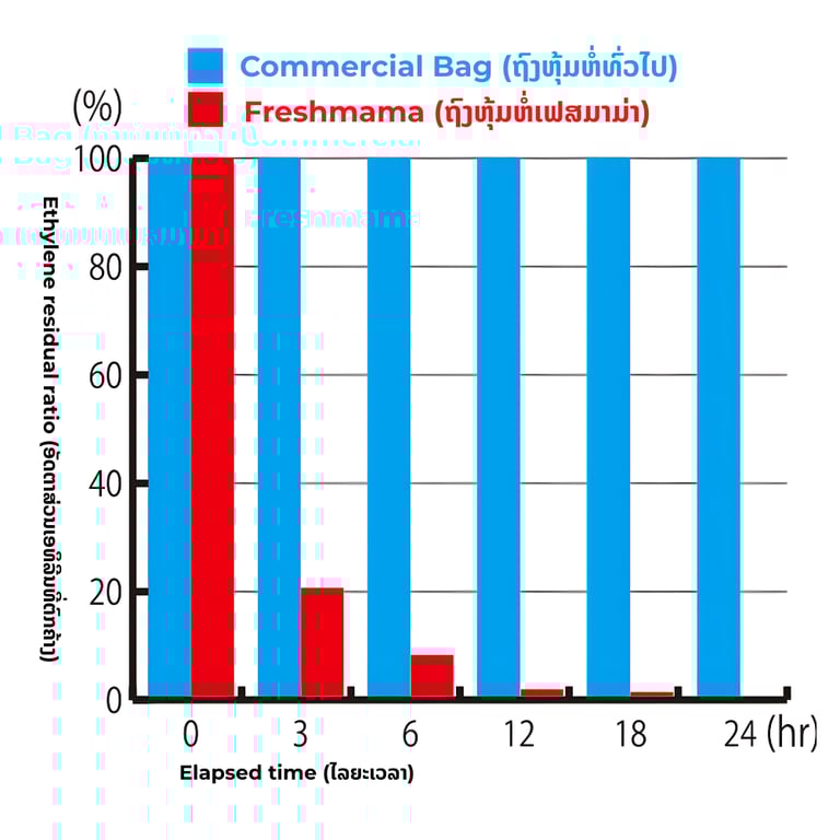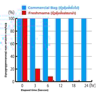 This document has demonstrated the ability to decompose a high concentration of ethylene in a short time. Investigation of the situation in the sample bag after decomposition of ethylene has confirmed this pad not only decomposed ethylene gas, but also excreted as carbon dioxide in water. Verification experiment was carried out on tomatoes, mini tomatoes, spinach… and also showed that this material has a fresh preservation effect.