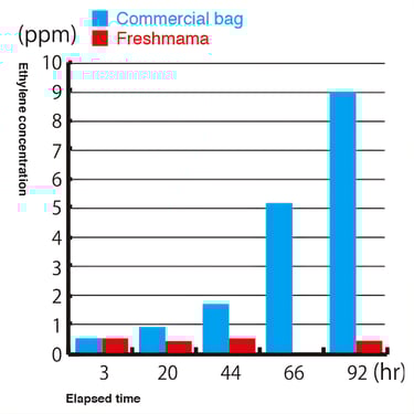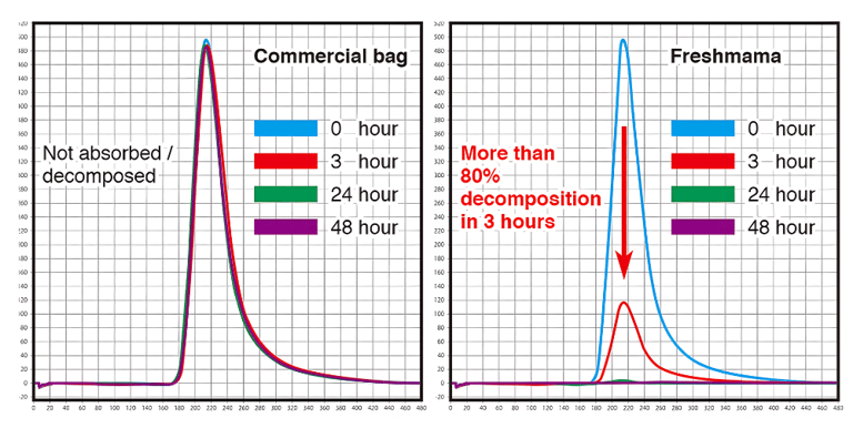 In order to investigate whether the fruit-derived ethylene gas was decomposed, the same amount of mini-tomatoes were enclosed in the sample bag and the control bag, and after 3 hours, 20 hours, 44 hours, 68 hours and 92 hours in the bag of ethylene gas concentration was measured. As a result, it was clarified that the ethylene concentration increases in the control bag, while the accumulation of the ethylene gas in the sample is suppressed to within 0.6 ppm.